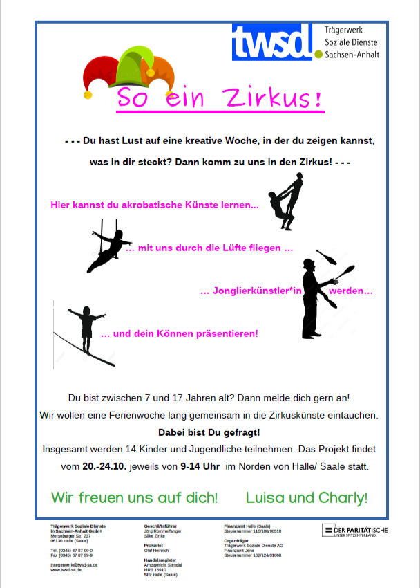 Wir wollen eine Ferienwoche lang gemeinsam in die Zirkuskünste eintauchen. Dabei bist Du gefragt! Es sind noch Plätze frei.